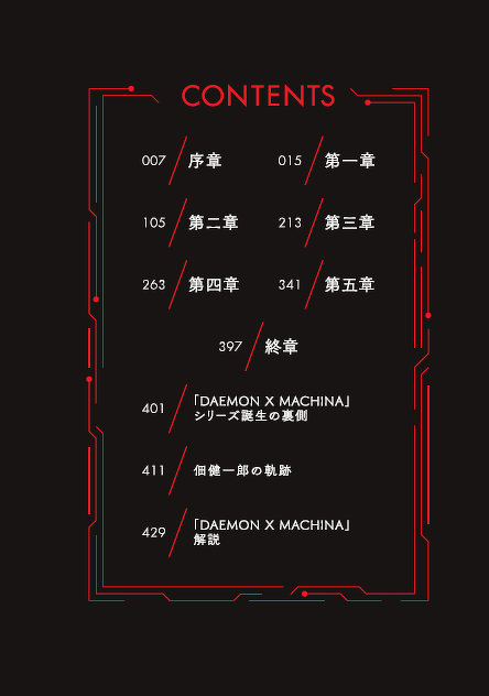 「DAEMON X MACHINA」公式サイトで連載されているWeb小説『DAEMON X MACHINA 星の解放者』全編だけでなく、シリーズ開発プロデューサー・佃健一郎氏への約30ページにわたる大ボリュームな独占インタビューや、佃氏本人による作品・キャラクター解説など、巻末付録も盛りだくさん!!!