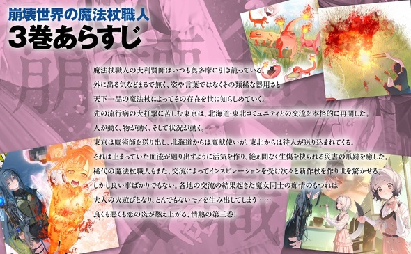 先の流行病の大打撃に苦しむ東京は、北海道・東北コミュニティとの交流を本格的に再開した。人が動く、物が動く、そして状況が動く。東京は魔術師を送り出し、北海道からは魔獣使いが、東北からは狩人が送り込まれてくる。それは止まっていた血流が廻り出すように活気を作り、絶え間なく生傷を抉られる災害の爪跡を癒した。稀代の魔法杖職人もまた、交流によってインスピレーションを受け次々と新作杖を作り世を驚かせる。