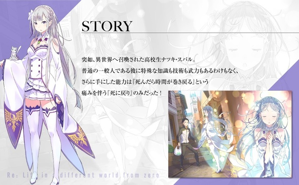 コンビニ帰りに突如、異世界に召喚された高校生・菜月昴。これは流行りの異世界召喚か!? しかし召喚者はおらず、物盗りに襲われ早々に訪れる命の危機。そんな彼を救ったのは、謎の銀髪美少女と猫精霊だった。恩を返す名目でスバルは少女の物探しに協力する。だが、ようやくその手がかりが掴めた時、スバルと少女は何者かに襲撃され命を落とした――筈が、スバルは気づくと初めて異世界召喚された場所にいた。「死に戻り」――無力な少年が手にしたのは、死して時間を巻き戻す、唯一の能力。幾多の絶望を越え、死の運命から少女を救え! 大人気WEB小説、待望の書籍化! ――たとえ君が忘れていても、俺は君を忘れない。