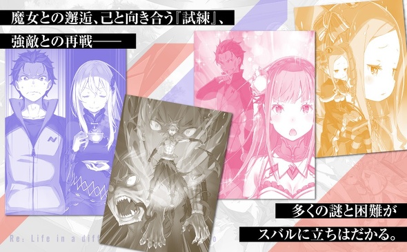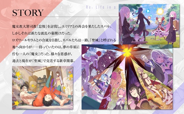 魔女教大罪司教『怠惰』を討伐し、エミリアとの再会を果たしたナツキ・スバル。辛い決別を乗り越えて和解した二人、しかしそれは新たな波乱の幕開けだった。避難した村人の半数が戻らず、不安に揺れるアーラム村。同じく戻らないロズワールやラムとの合流を目指し、スバルたちは一路、『聖域』と呼ばれる地へ向かう。そこでスバルたちを待っていたのは、一筋縄ではいかない住人たちと、妖しげに笑うロズワール。――そして、夢の草原に佇む一人の『魔女』だった。