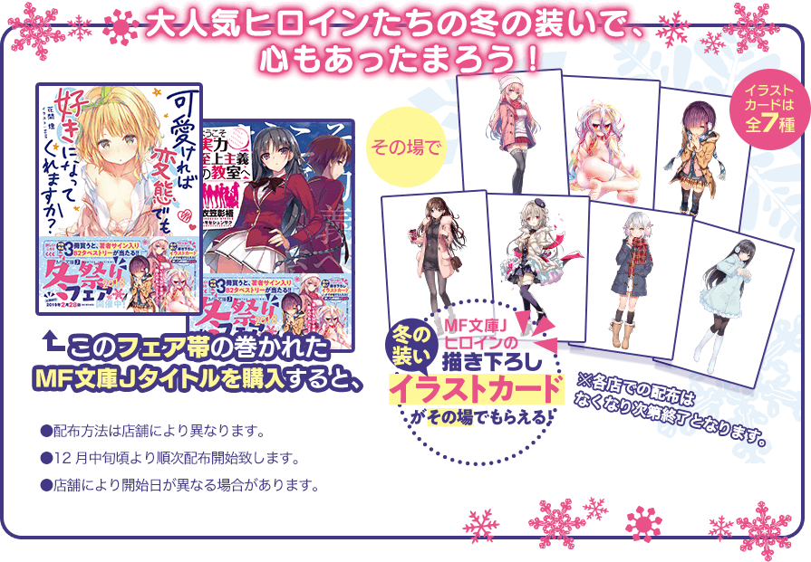 「MF文庫J 2018冬祭りフェア」帯についている応募券を切り取って郵便ハガキに3ポイント分貼り、住所・氏名・年齢・性別・希望タイトルを記入し、下記宛先にお送りください。